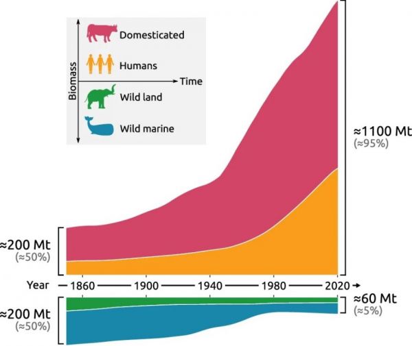 The total biomass of wild land animals has declined, but not nearly as much as that of marine mammals. That decline is mostly the result of hunting whales. The number of whales dropped steeply during the 20th century, and has only recovered slightly since whaling bans went into effect. Read more about these changes and their causes in the published paper. -via Damn Interesting