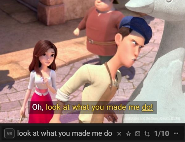 As an experiment, I searched for "look at what you made me do," figuring that, as a commonplace term of psychological abuse, it would appear in films. It shows up in at least ten films, including the 2019 South Korean animated feature Red Shoes and the Seven Dwarfs.